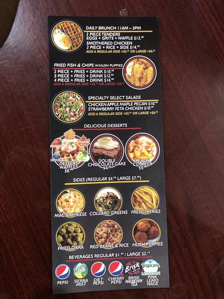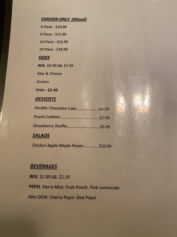 Feeds family of four. 10 pieces mix, two large sides and four waffles.