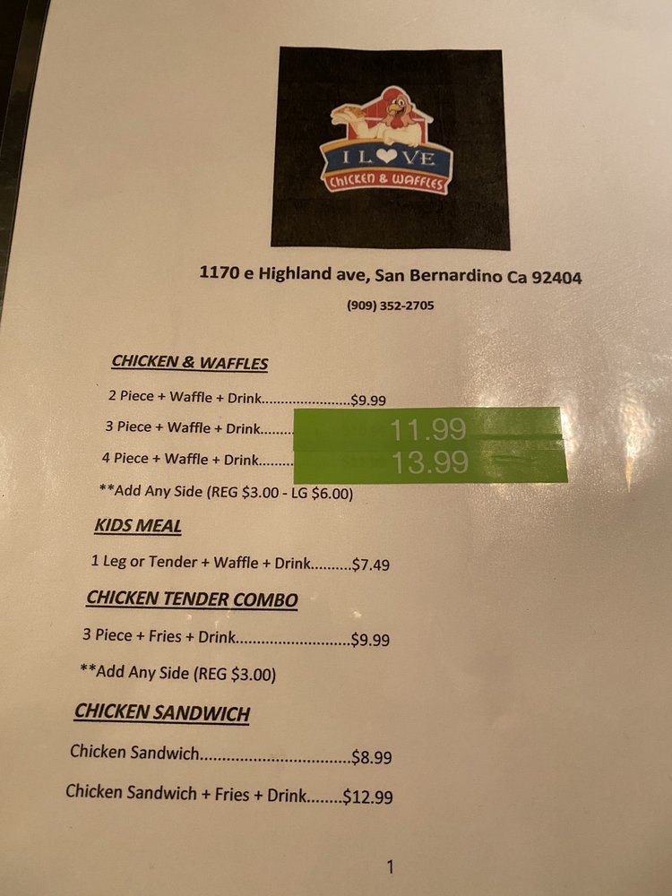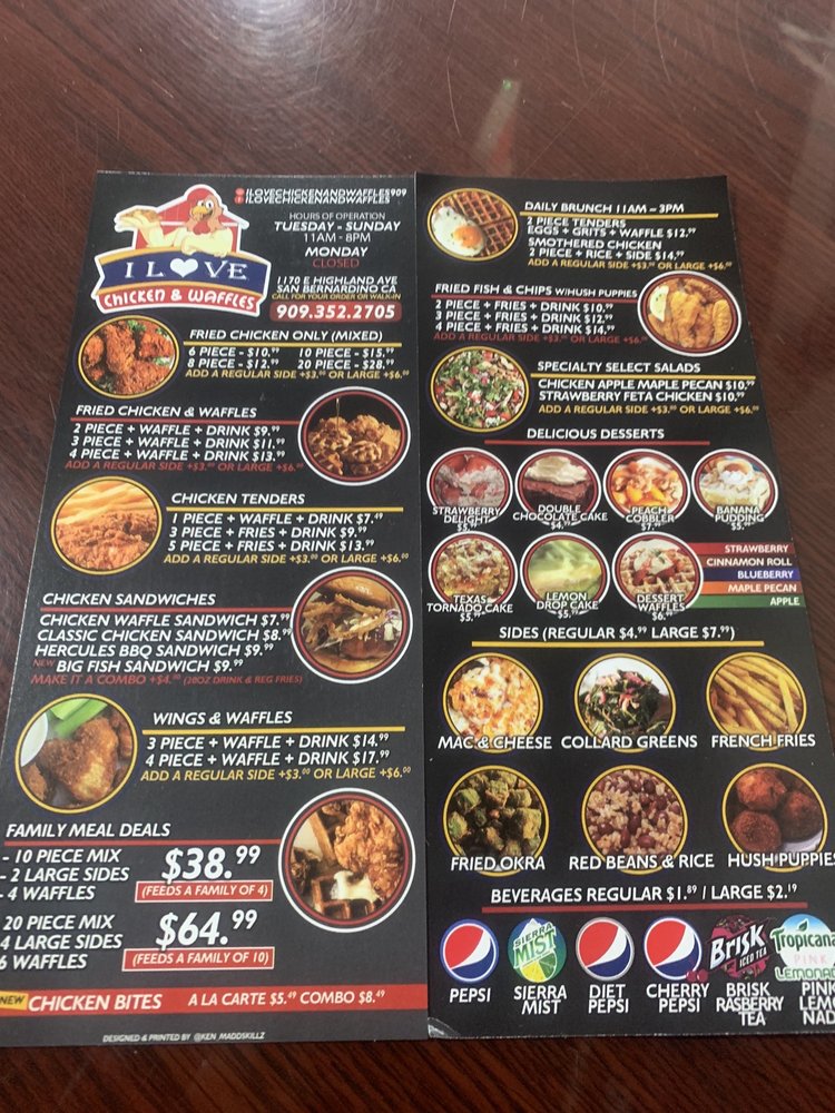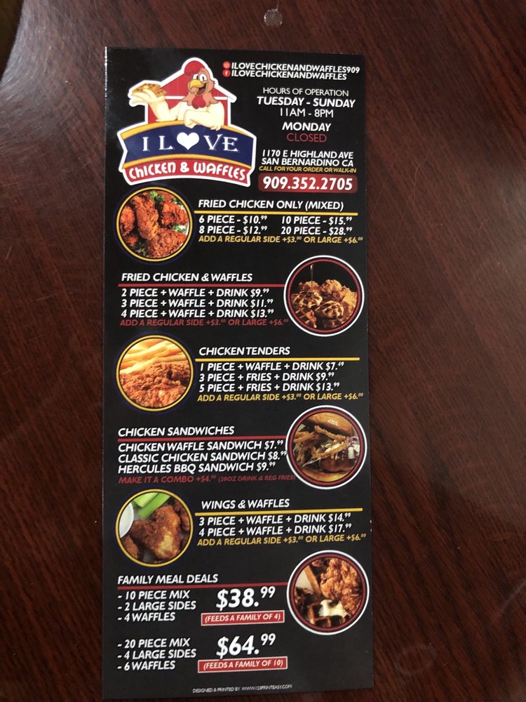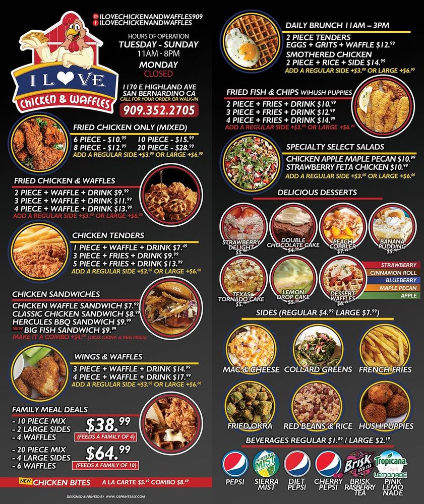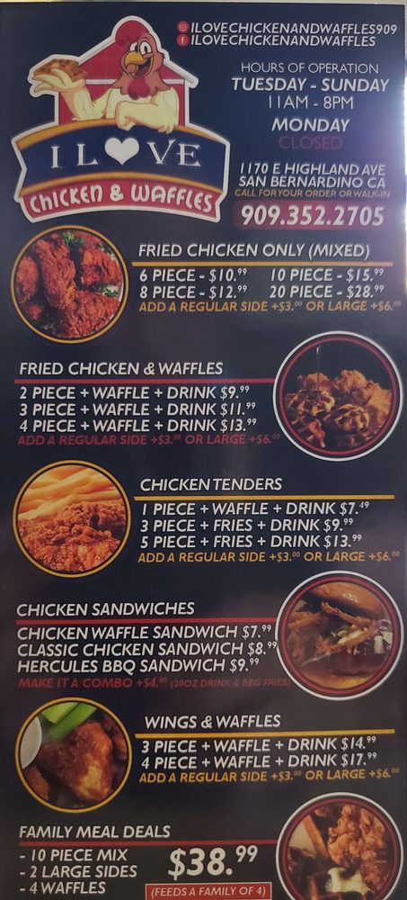 "I Love Chicken & Waffles" is a casual dining spot located in San Bernardino, CA, offering a variety of mouth-watering dishes. From their signature Chicken and Waffles combo to the flavorful Chicken Tender Combos, there is something for everyone. Customers rave about the tasty food and generous portions, with favorites like grits, okra, Mac & Cheese, and red beans and rice. The ambiance is described as cool and inviting, perfect for a laid-back meal. Many patrons appreciate the friendly service and the welcoming atmosphere, making it a great spot for both solo diners and families. If you're craving authentic Southern comfort food, "I Love Chicken & Waffles" is the place to be.